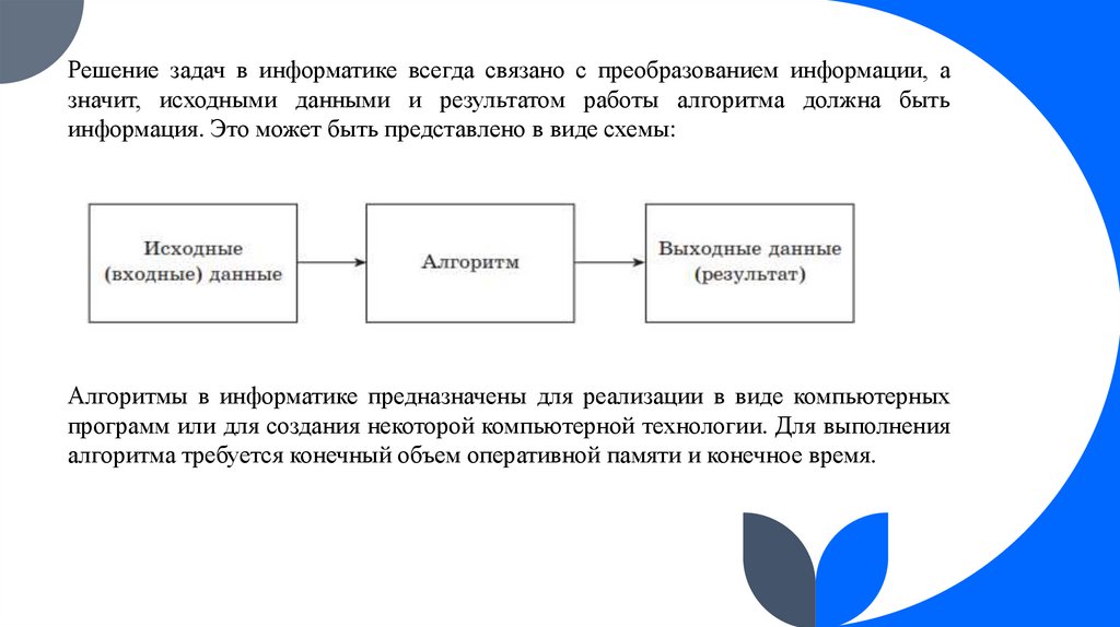 Решение задач в информатике всегда связано с преобразованием информации, азначит, исходными данными и результатом работы алгоритма должна быть