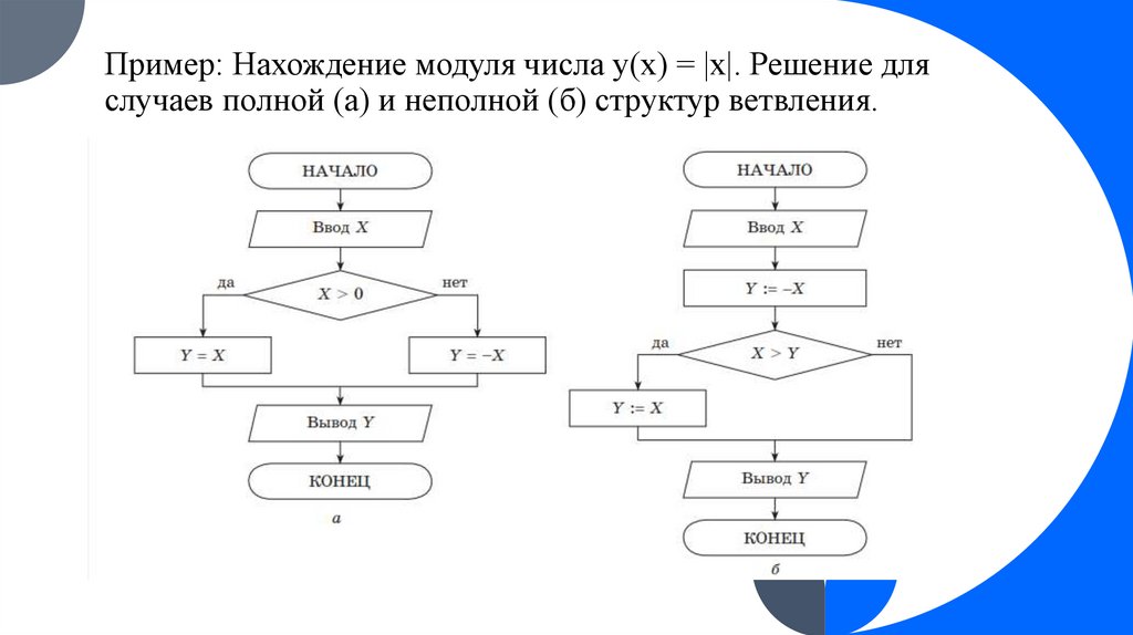 Пример: Нахождение модуля числа y(x) = |x|. Решение дляслучаев полной (а) и неполной (б) структур ветвления.