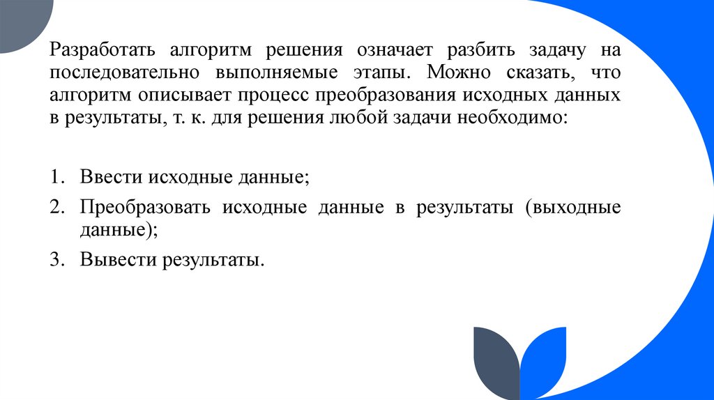 Разработать алгоритм решения означает разбить задачу напоследовательно выполняемые этапы. Можно сказать, что
