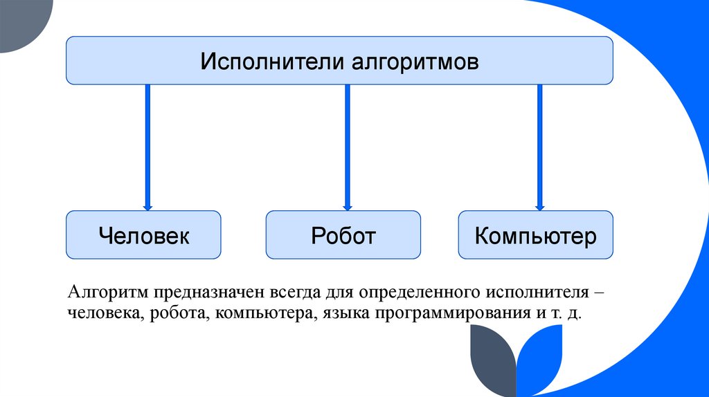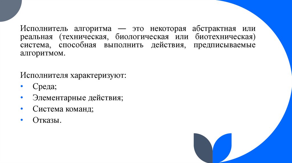 Исполнитель алгоритма ― это некоторая абстрактная илиреальная (техническая, биологическая или биотехническая)