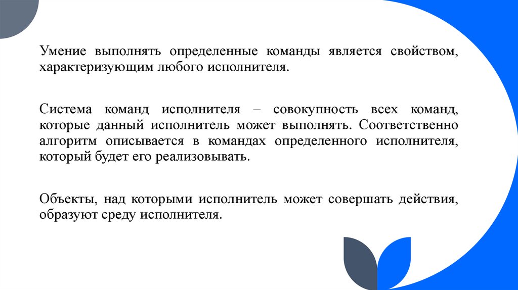 Умение выполнять определенные команды является свойством,характеризующим любого исполнителя.