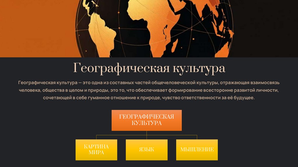 Географическая культураГеографическая культура — это одна из составных частей общечеловеческой культуры, отражающая взаимосвязь