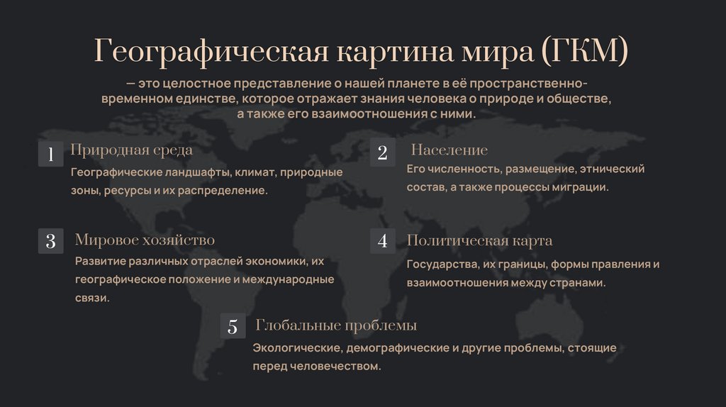 Географическая картина мира (ГКМ)— это целостное представление о нашей планете в её пространственновременном единстве, которое отражает знания человека о природе и обществе,