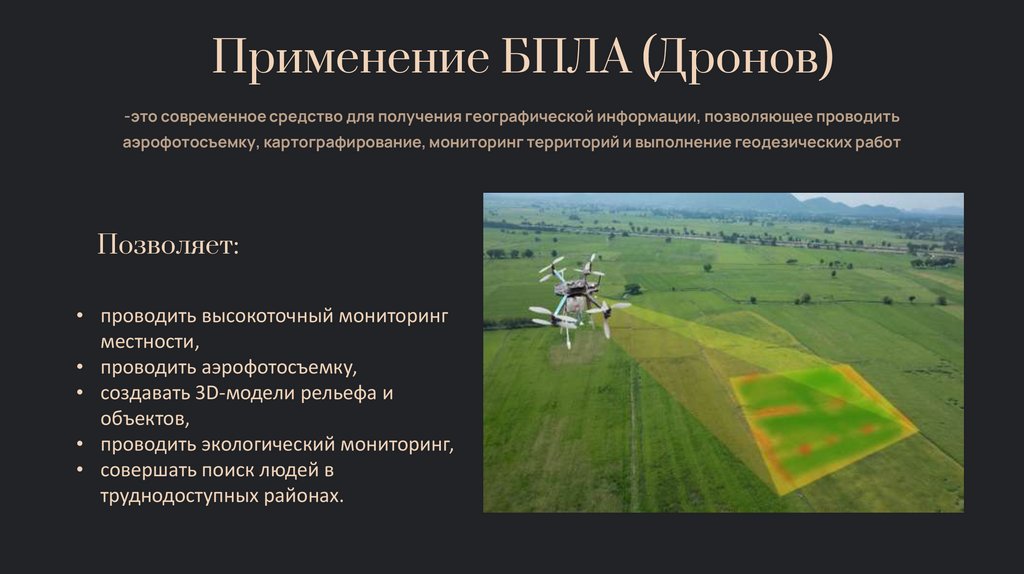 Применение БПЛА (Дронов)-это современное средство для получения географической информации, позволяющее проводить