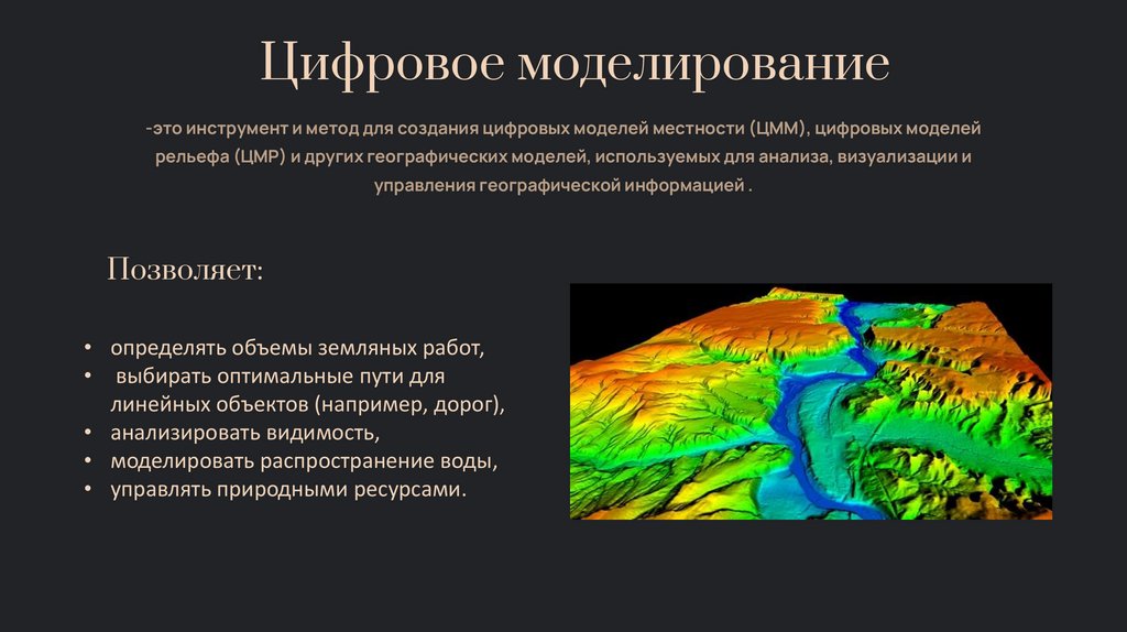 Цифровое моделирование-это инструмент и метод для создания цифровых моделей местности (ЦММ), цифровых моделей
