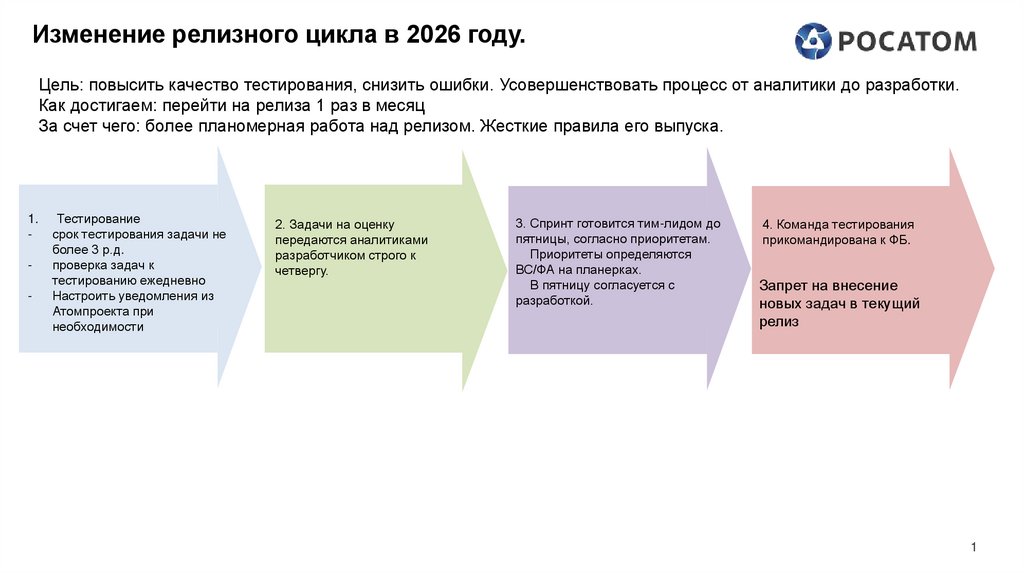 Изменение релизного цикла в 2026 году.Цель: повысить качество тестирования, снизить ошибки. Усовершенствовать процесс от аналитики до разработки.