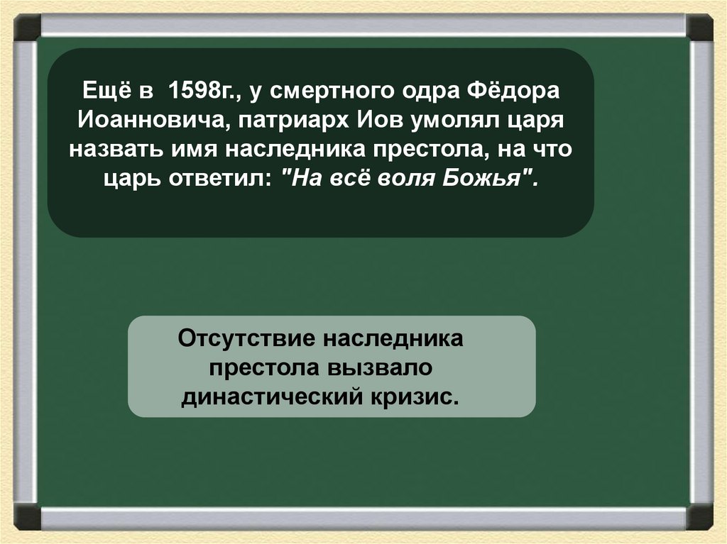 8. Февраль 1598 г. – Земский собор и патриарх избрали Бориса Годунова царем. Сентябрь 1598 г. – венчание на царство Бориса