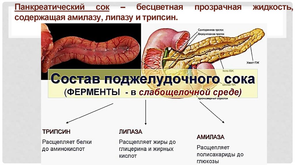 Панкреатический сок – бесцветнаясодержащая амилазу, липазу и трипсин.