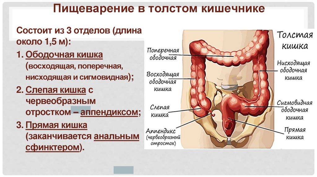 Пищеварение в толстом кишечникеСостоит из 3 отделов (длина