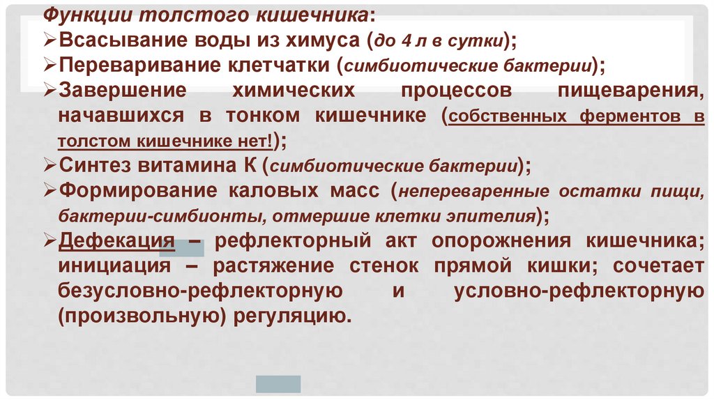 Функции толстого кишечника:Всасывание воды из химуса (до 4 л в сутки);
