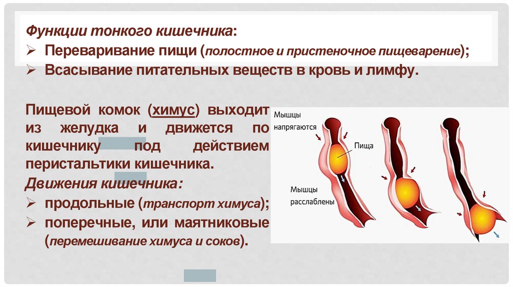 Функции тонкого кишечника:Переваривание пищи (полостное и пристеночное пищеварение);