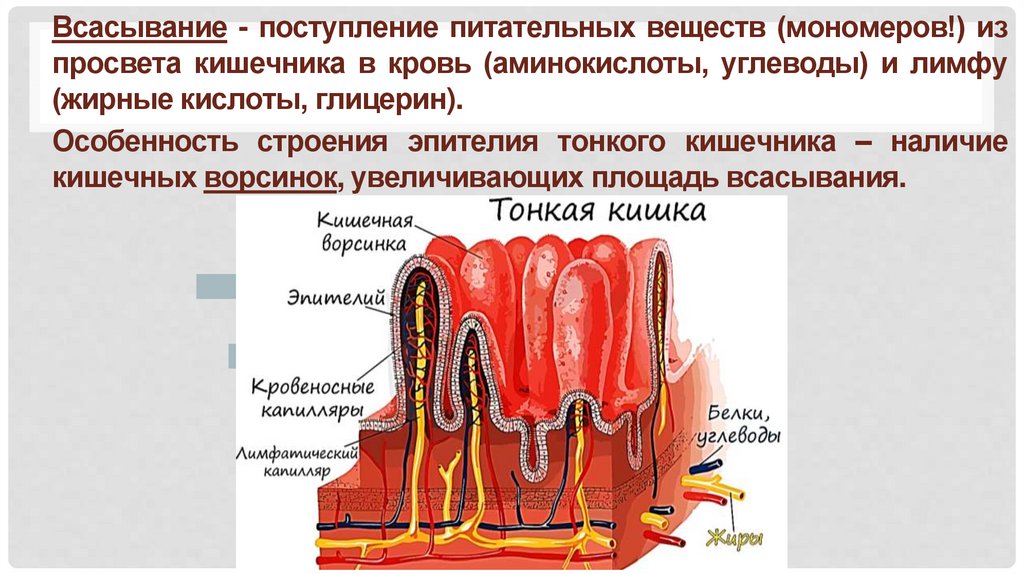 Всасывание - поступление питательных веществ (мономеров!) изпросвета кишечника в кровь (аминокислоты, углеводы) и лимфу