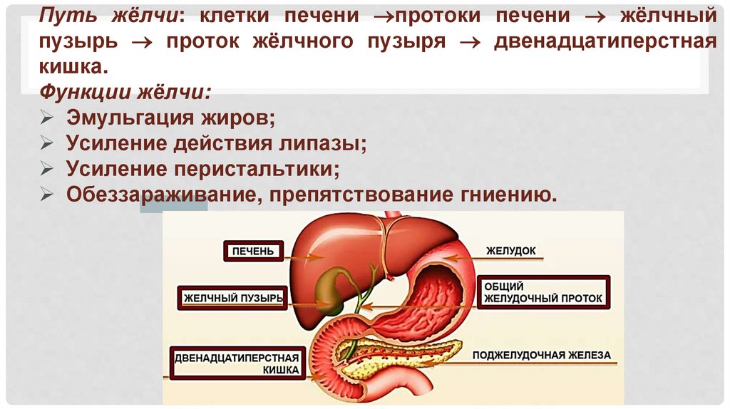 Путь жёлчи: клетки печени протоки печени жёлчныйпузырь проток жёлчного пузыря двенадцатиперстная
