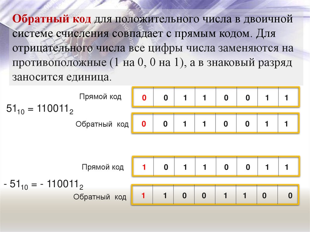Обратный код для положительного числа в двоичнойсистеме счисления совпадает с прямым кодом. Для