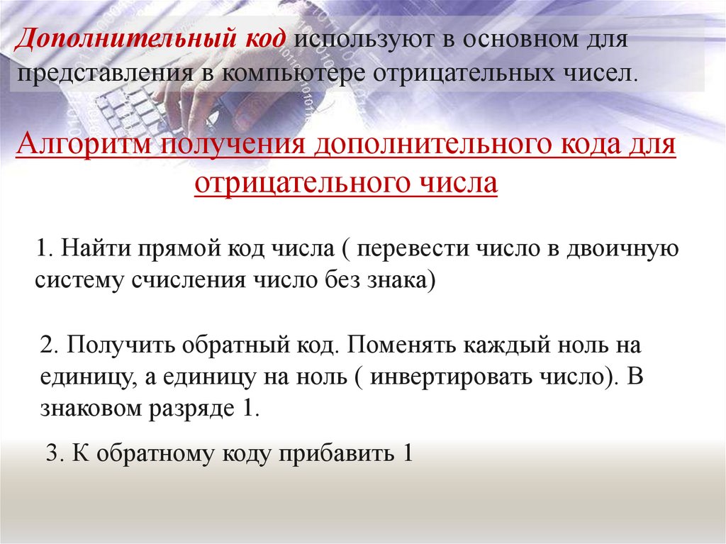 Дополнительный код используют в основном дляпредставления в компьютере отрицательных чисел.