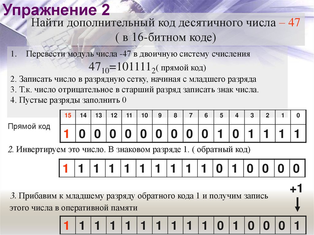 Упражнение 2Найти дополнительный код десятичного числа – 47