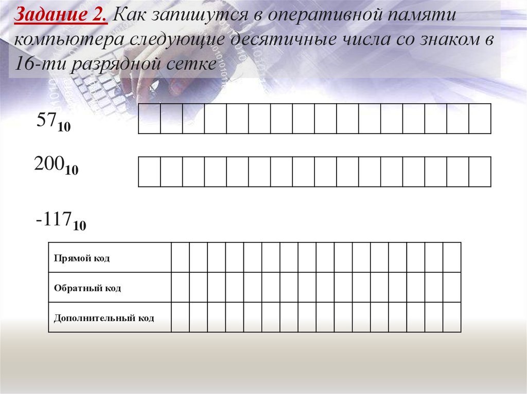 Задание 2. Как запишутся в оперативной памятикомпьютера следующие десятичные числа со знаком в