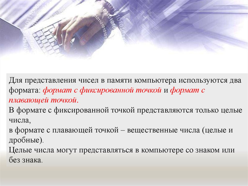 в формате с плавающей точкой – вещественные числа (целые и