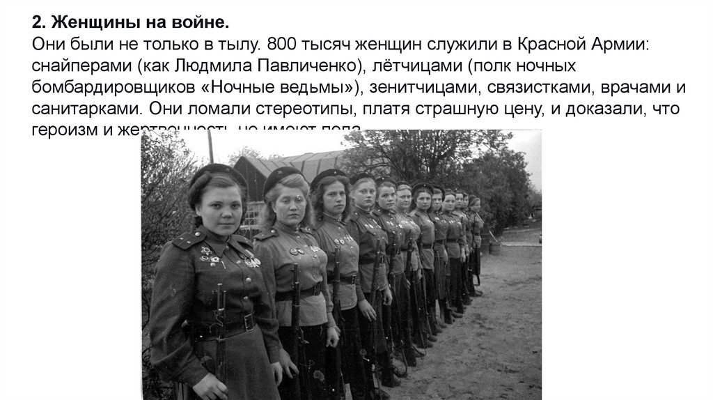 2. Женщины на войне.Они были не только в тылу. 800 тысяч женщин служили в Красной Армии: