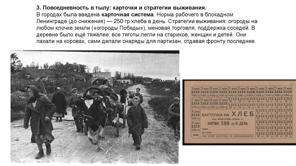 3. Повседневность в тылу: карточки и стратегии выживания.В городах была введена карточная система. Норма рабочего в блокадном