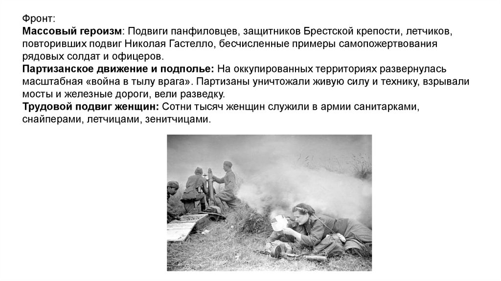 Фронт:Массовый героизм: Подвиги панфиловцев, защитников Брестской крепости, летчиков,
