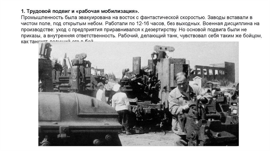 1. Трудовой подвиг и «рабочая мобилизация».Промышленность была эвакуирована на восток с фантастической скоростью. Заводы вставали в