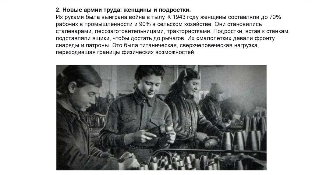 2. Новые армии труда: женщины и подростки.Их руками была выиграна война в тылу. К 1943 году женщины составляли до 70%