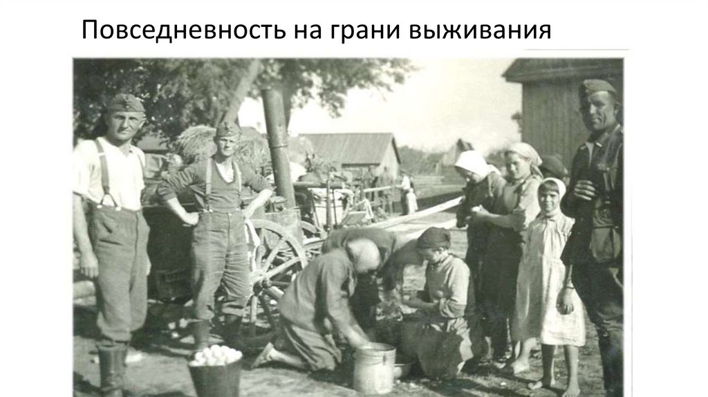 любом клочке земли («огороды Победы»), меновая торговля, поддержка соседей. В