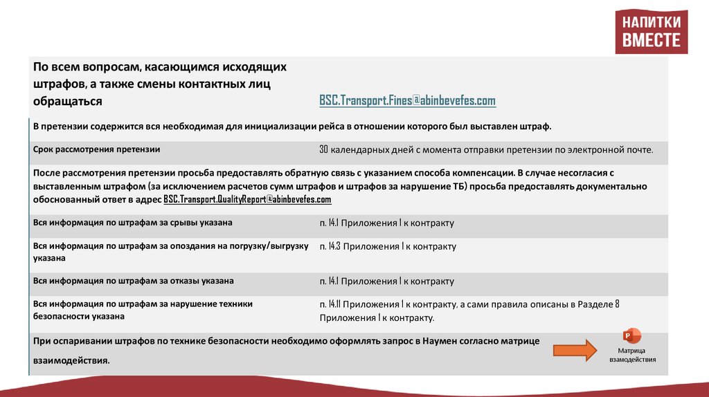 Подробные условия по выставлению претензий в адрес АО АБ ИнБев Эфес указаны в договоре п.13 Соглашения по логистике.