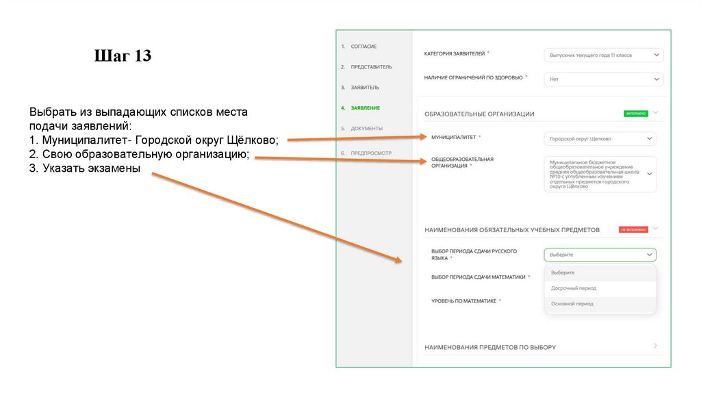 Шаг 13Выбрать из выпадающих списков места