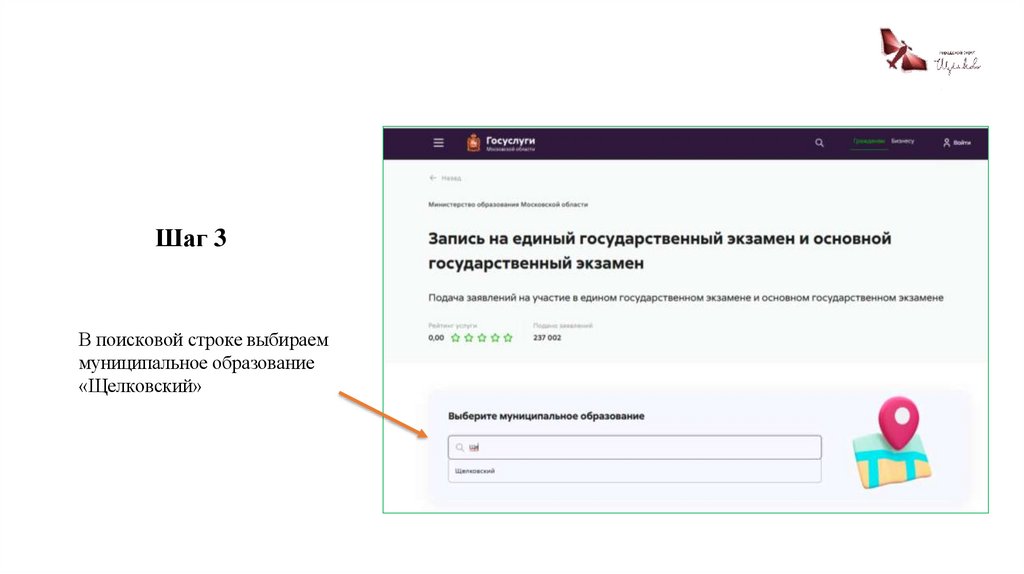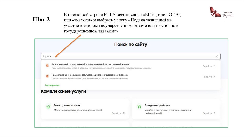 Шаг 2В поисковой строке РПГУ ввести слова «ЕГЭ», или «ОГЭ»,