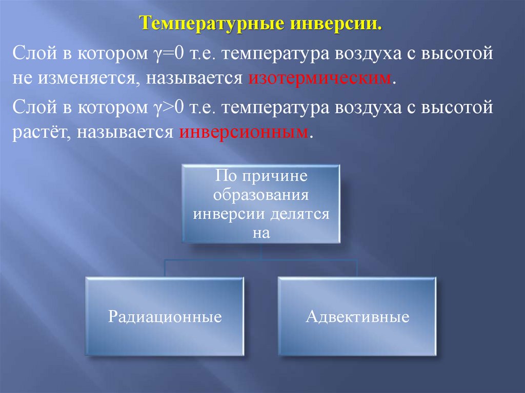 Температурные инверсии.Слой в котором γ=0 т.е. температура воздуха с высотой