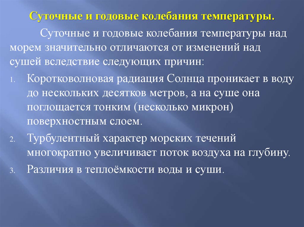 3. Различия в теплоёмкости воды и суши.