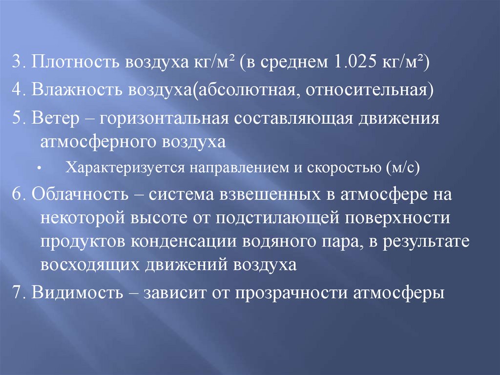 3. Плотность воздуха кг/м² (в среднем 1.025 кг/м²)4. Влажность воздуха(абсолютная, относительная)