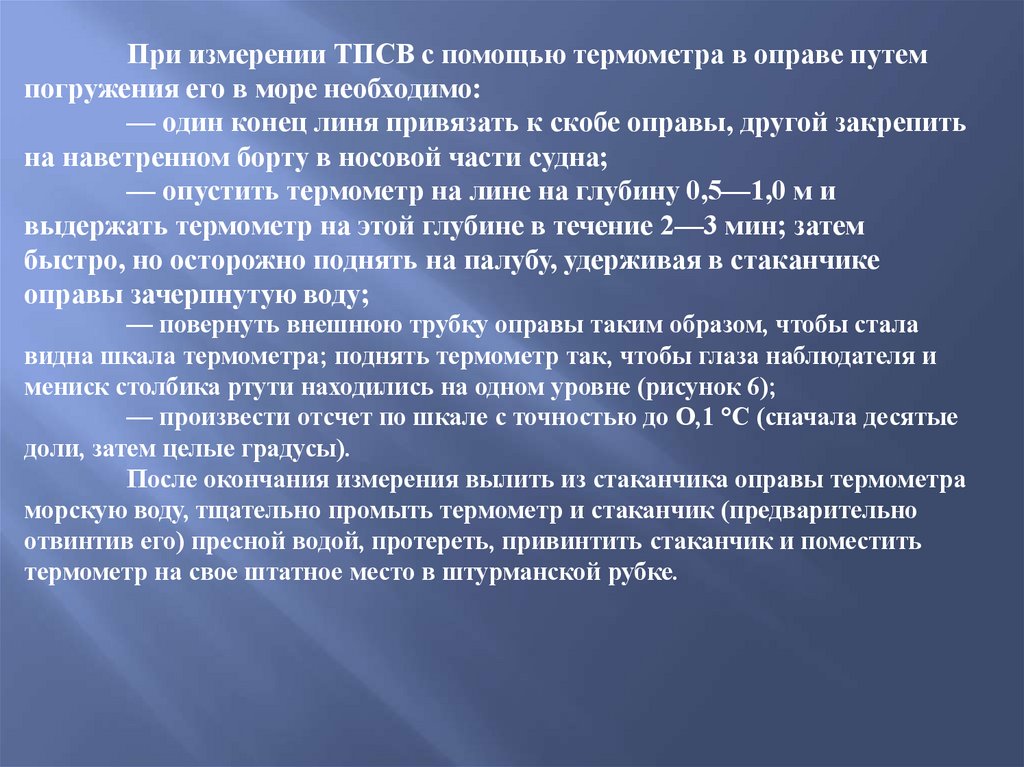 При измерении ТПСВ с помощью термометра в оправе путемпогружения его в море необходимо:
