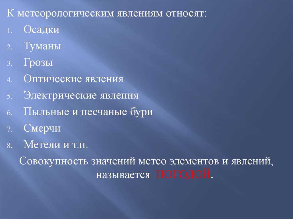 Совокупность значений метео элементов и явлений,