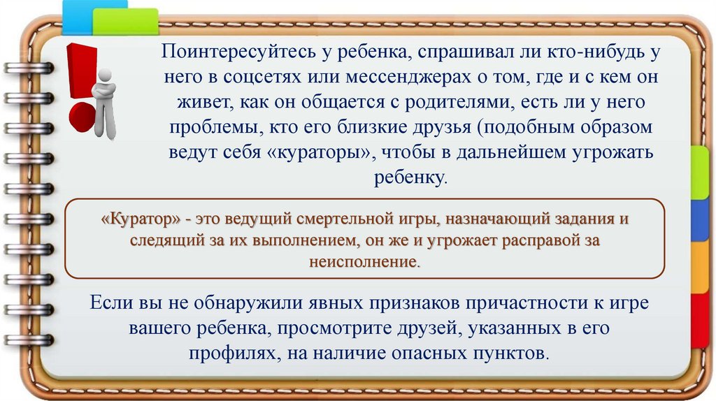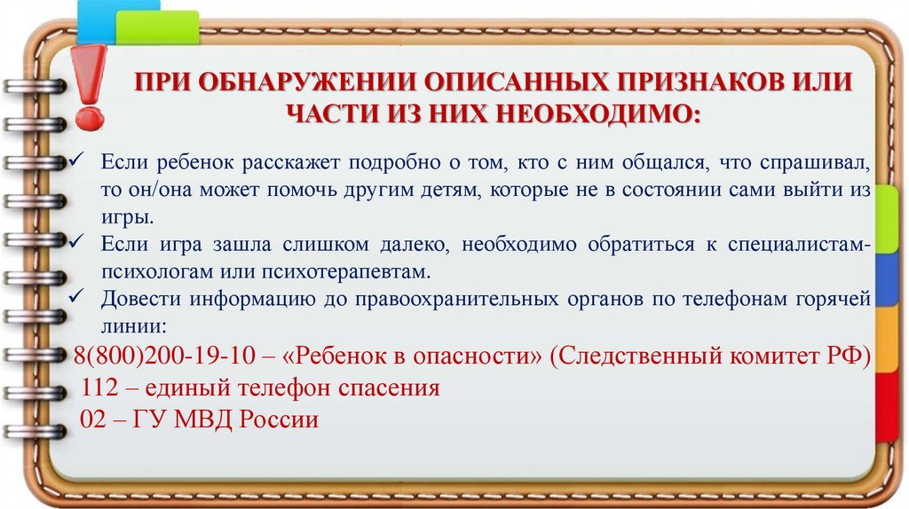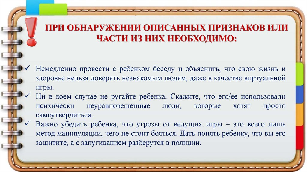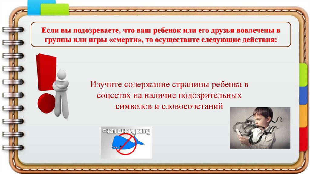 Если вы подозреваете, что ваш ребенок или его друзья вовлечены вгруппы или игры «смерти», то осуществите следующие действия:
