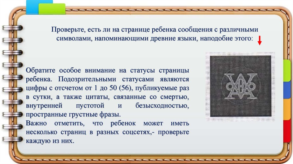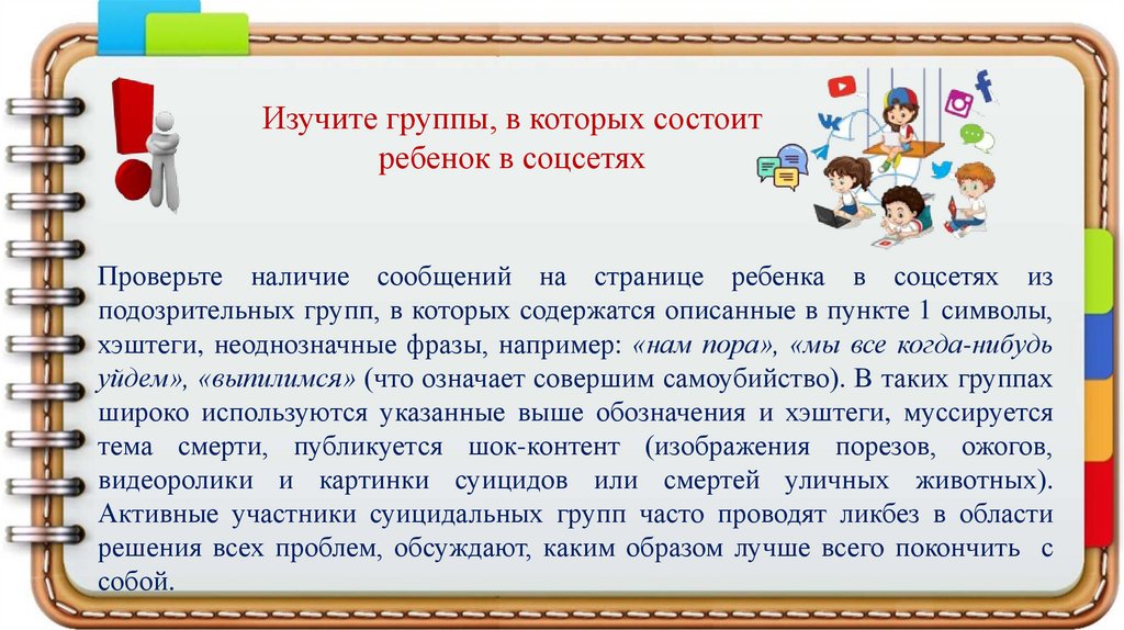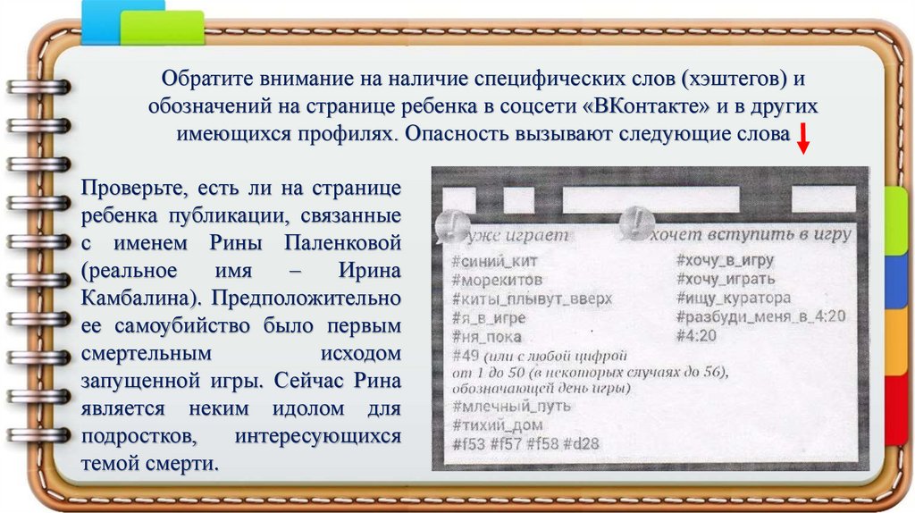 Обратите внимание на наличие специфических слов (хэштегов) иобозначений на странице ребенка в соцсети «ВКонтакте» и в других