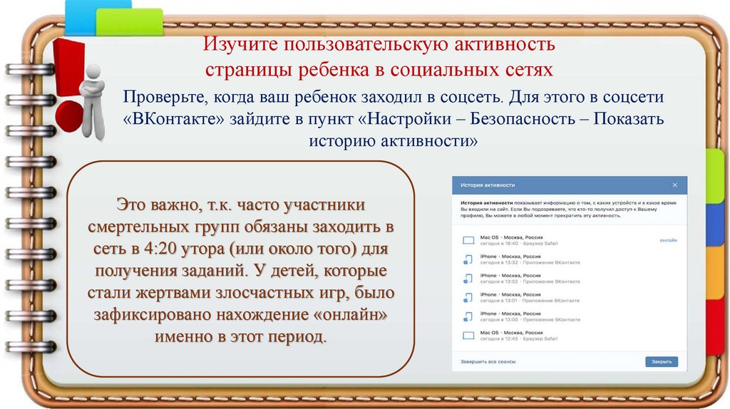 Проверьте, когда ваш ребенок заходил в соцсеть. Для этого в соцсети