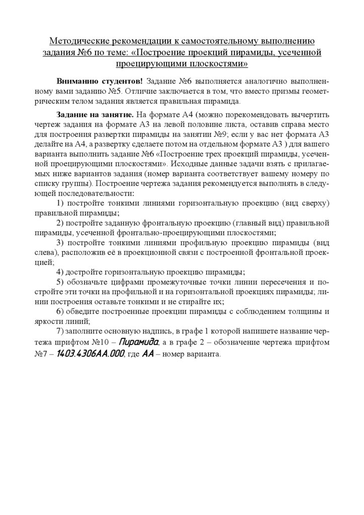 Вниманию студентов! Задание №6 выполняется аналогично выполненному вами заданию №5. Отличие заключается в том, что вместо призмы геометрическим телом задания является правильная пирамида.