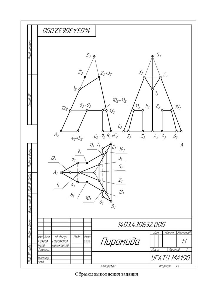 7) заполните основную надпись, в графе 1 которой напишете название чертежа шрифтом №10 – Пирамида; а в графе 2 – обозначение чертежа шрифтом