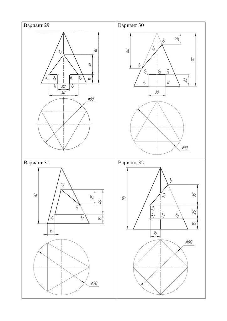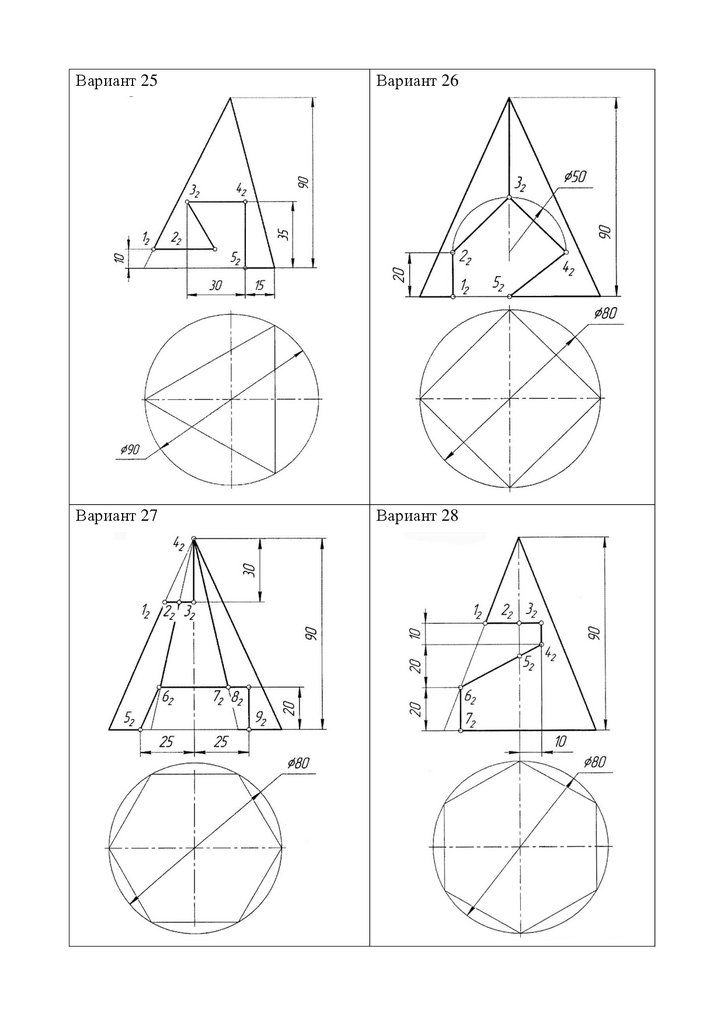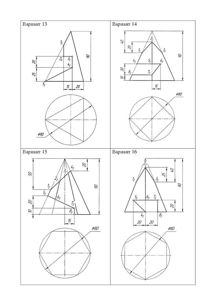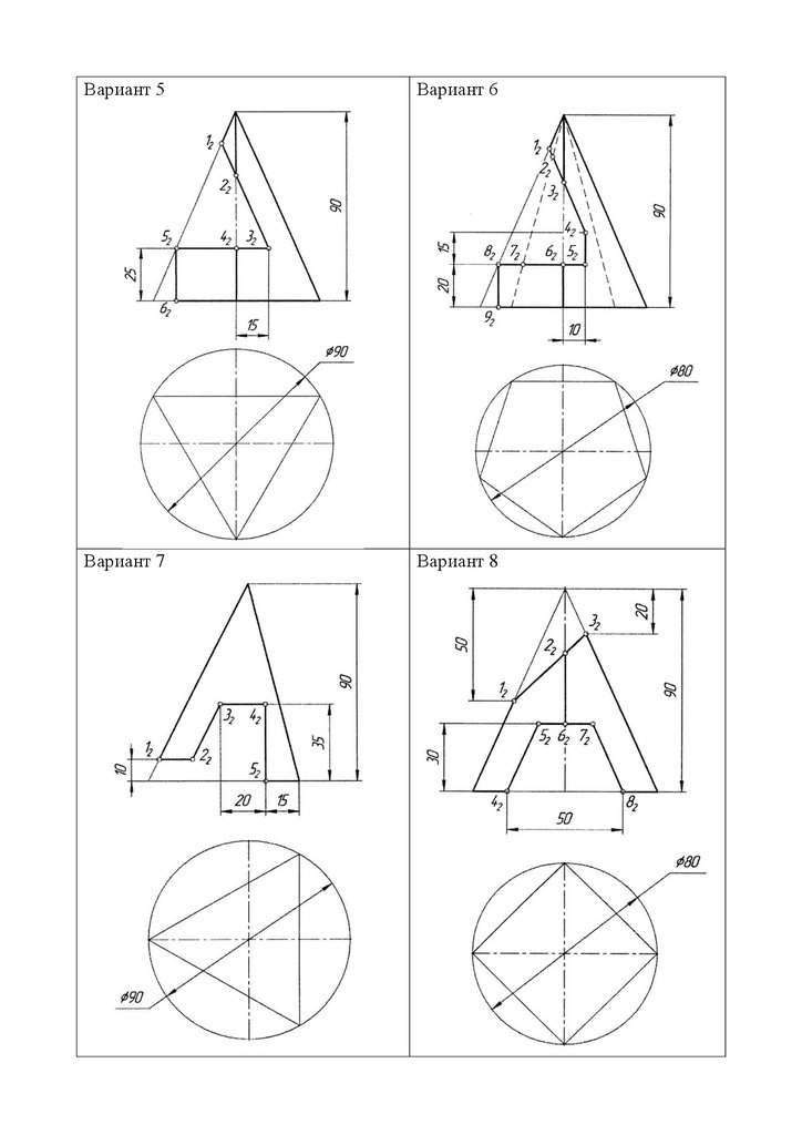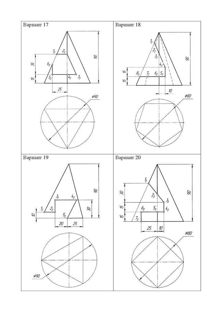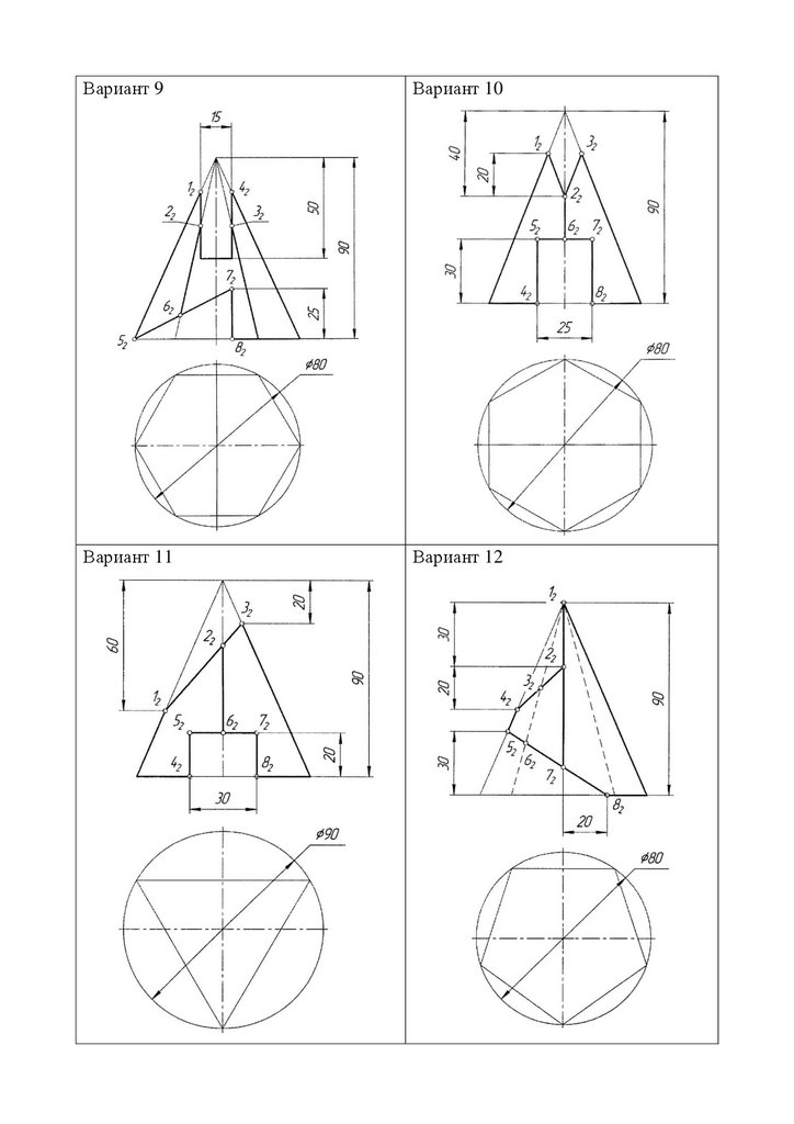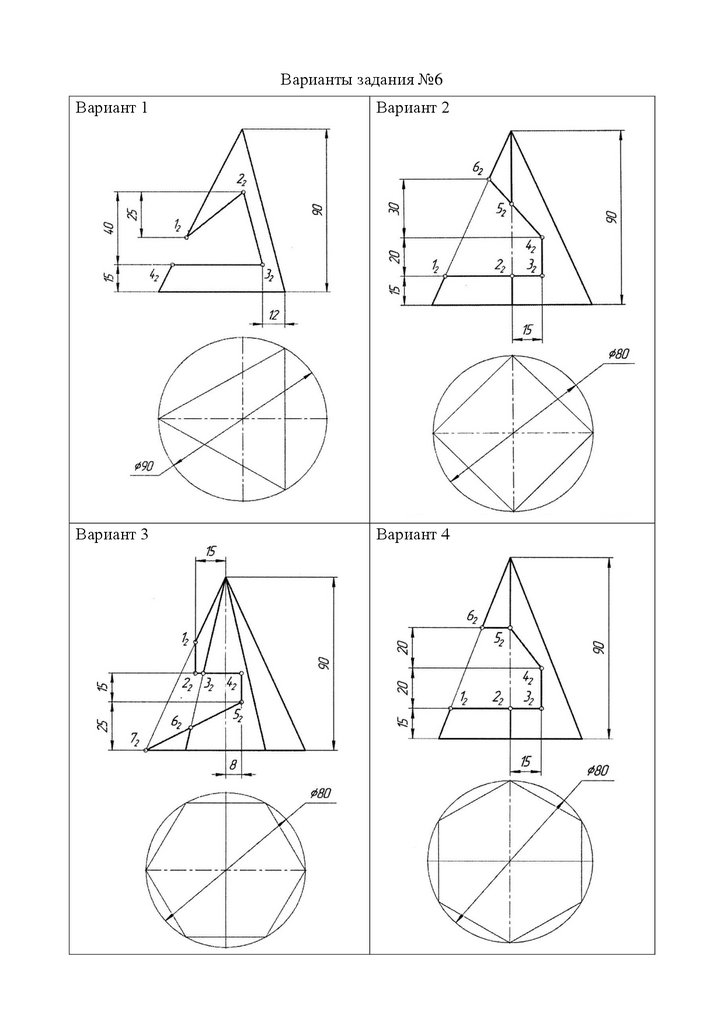 варианта выполнить задание №6 «Построение трех проекций пирамиды, усеченной проецирующими плоскостями». Исходные данные задачи взять с прилагаемых ниже вариантов задания (номер варианта соответствует вашему номеру по