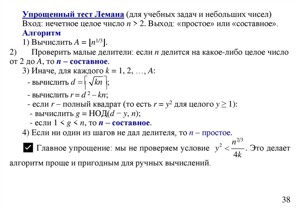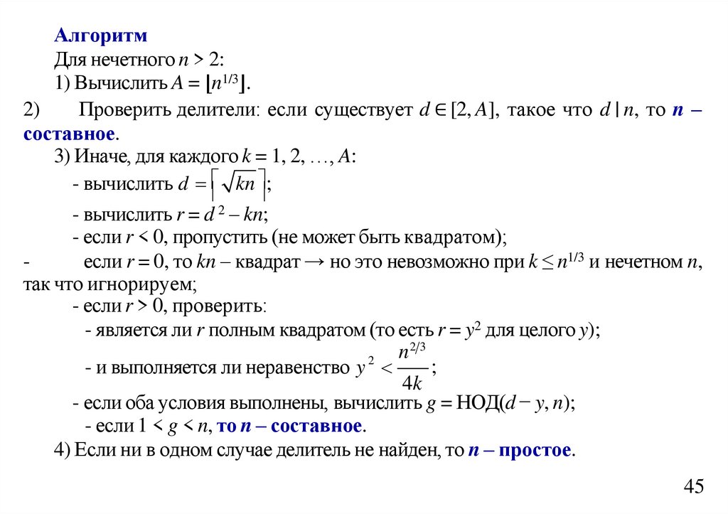 квадратом. Если до значения q = (n – 1)/2 полный квадрат не будет достигнут, то n – простое число.