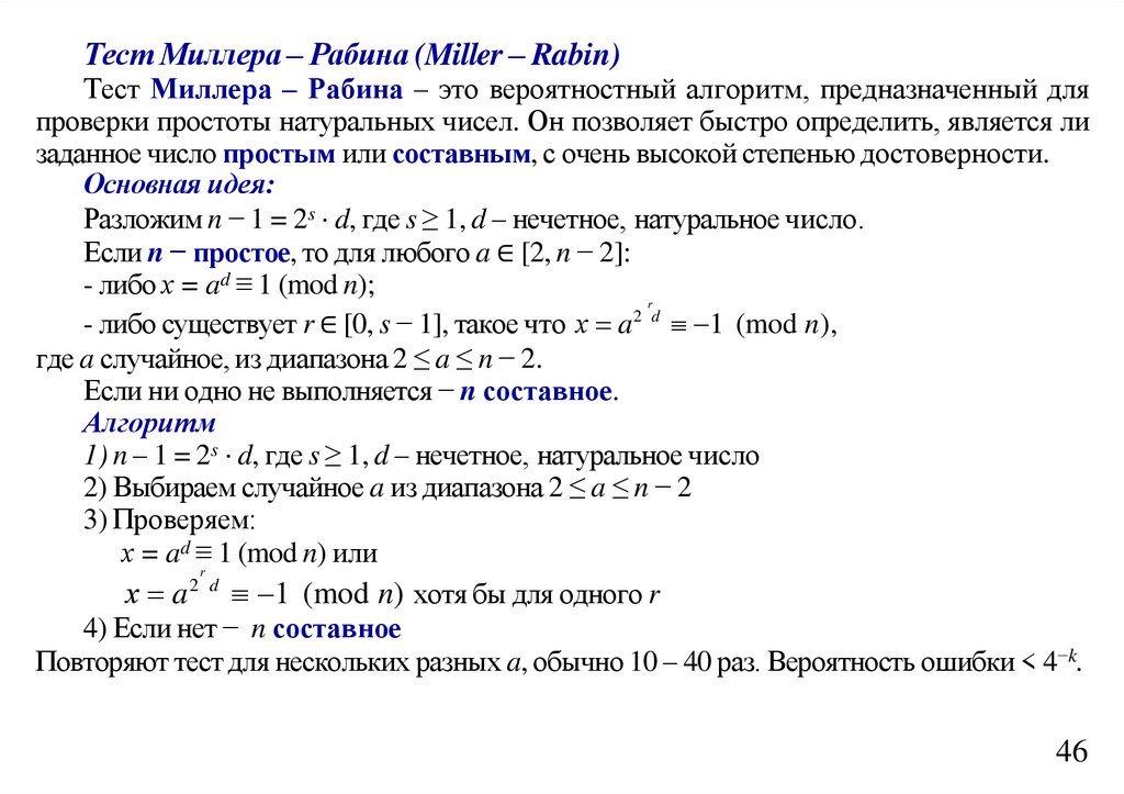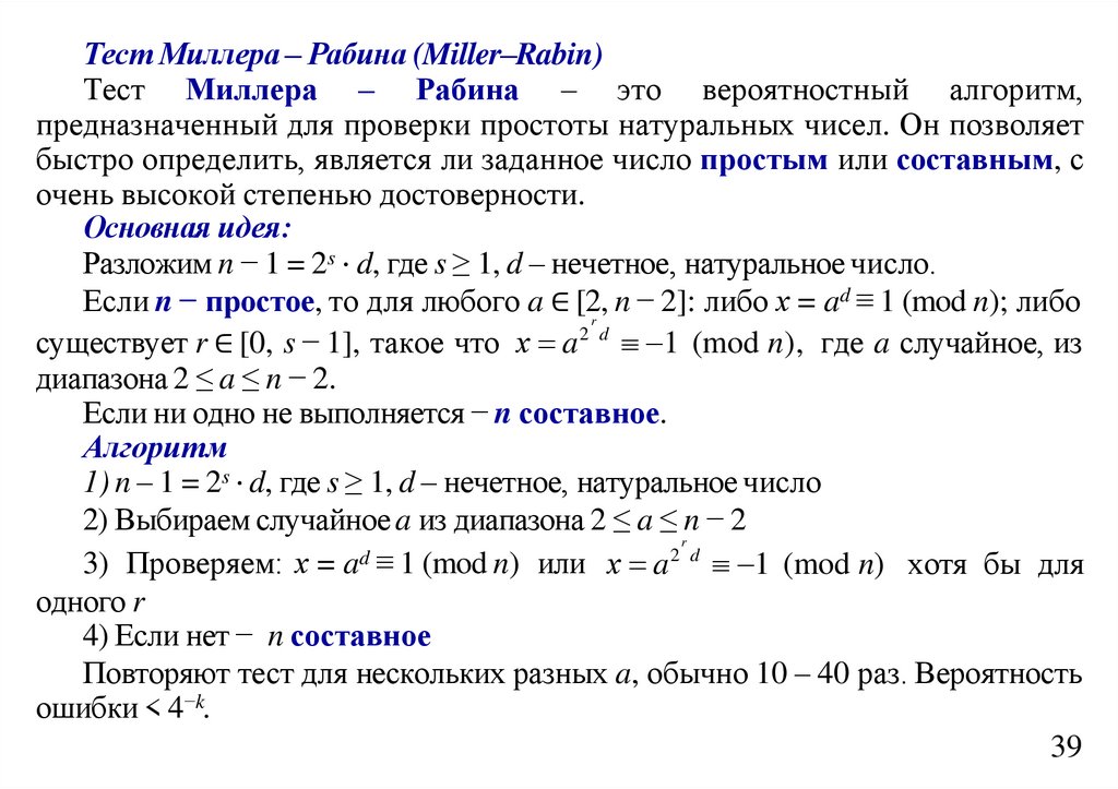 n > 2 и случайного a ∈ {2, 3, ..., n – 2}, взаимно простого с n, выполняется:
