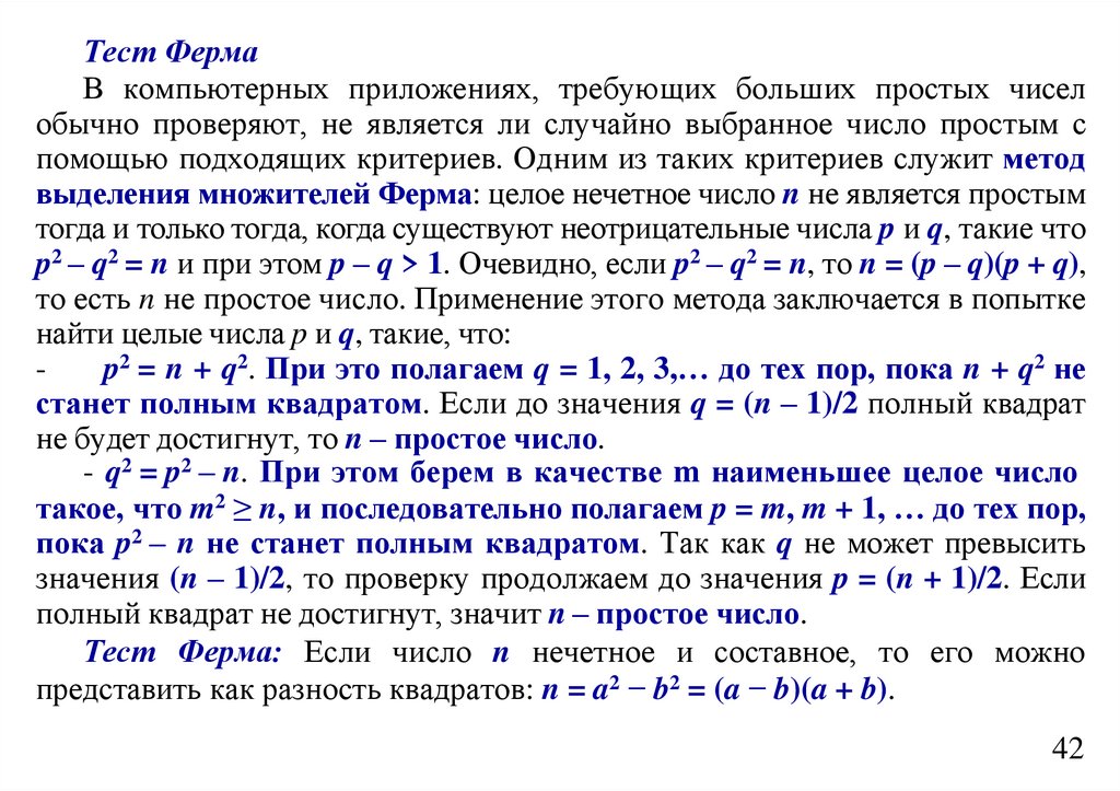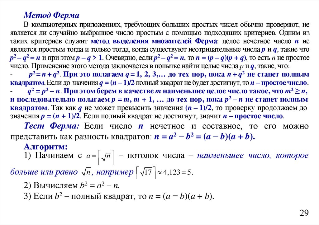 Метод ФермаВ компьютерных приложениях, требующих больших простых чисел обычно проверяют, не