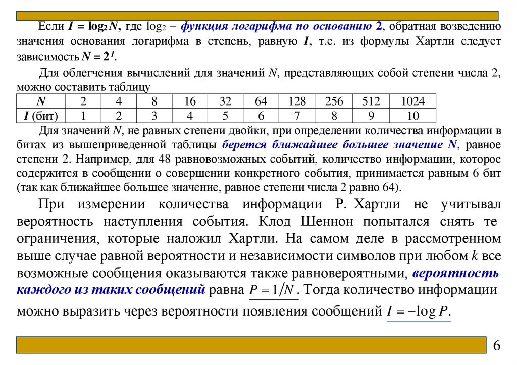 Если I = log2 N, где log2 – функция логарифма по основанию 2, обратная возведениюзначения основания логарифма в степень, равную I, т.е. из формулы Хартли следует