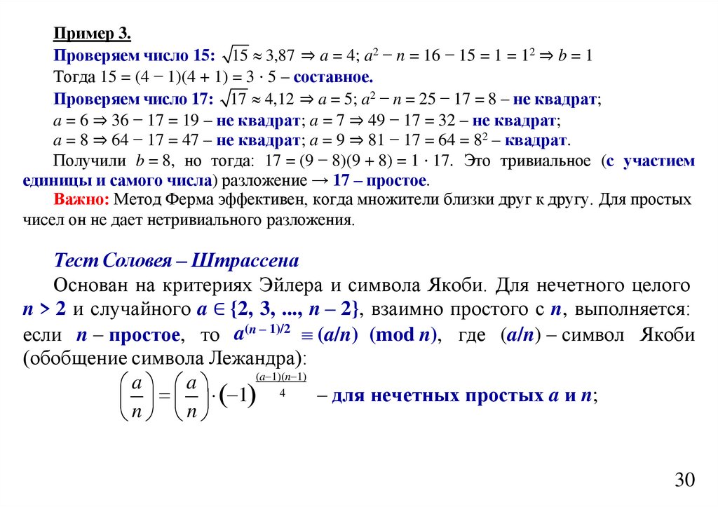 Пример 3.Проверяем число 15: 15 3,87 ⇒ a = 4; a2 − n = 16 − 15 = 1 = 12 ⇒ b = 1