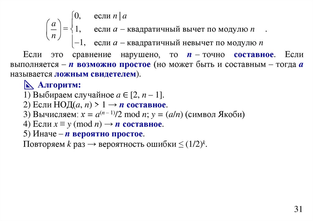 если n – простое, то a(n – 1)/2 (a/n) (mod n), где (a/n) – символ Якоби