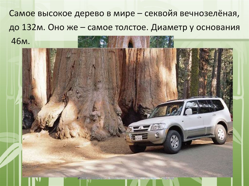 Самое высокое дерево в мире – секвойя вечнозелёная,до 132м. Оно же – самое толстое. Диаметр у основания