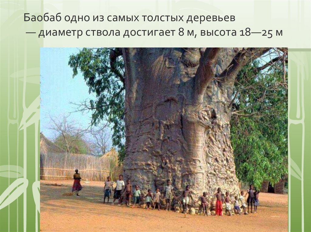 Баобаб одно из самых толстых деревьев— диаметр ствола достигает 8 м, высота 18—25 м